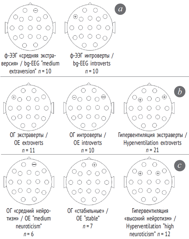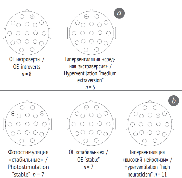 У испытуемых с низким уровнем нейротизма («стабильные») и у интровертов значимые корреляции с параметрами ЭЭГ выявляются чаще, чем в других группах. У интровертов это можно объяснить более существенным вкладом внутренних источников в активацию коры, у испытуемых с низким уровнем нейротизма — особенностями функциональных связей коры, обеспечивающих «стабильность» эмоциональных реакций и поведения. Для отдельных групп испытуемых различия в характере взаимосвязей параметров ЭЭГ с показателями экстраверсии и нейротизма чаще проявляются в относительно активном состоянии (открывание глаз, гипервентиляция, фотостимуляция), чем в состоянии полного покоя с закрытыми глазами. Это может указывать на отличия динамики функциональных связей при переходе от покоя к активности.
