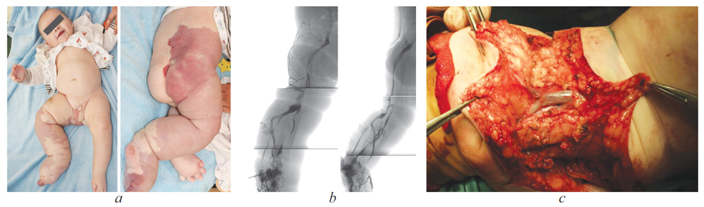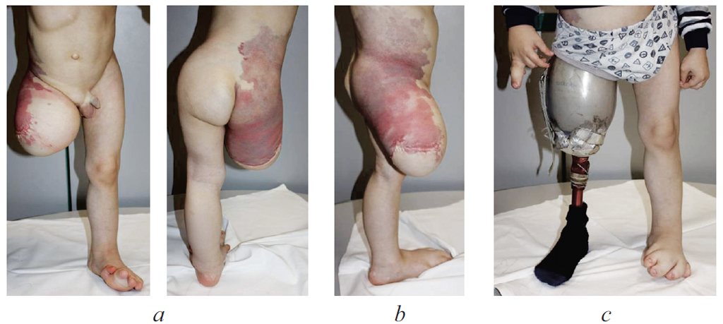 Рис. 2. Пациент К.В., 2 года: дисплазия магистральных вен, эмбриональный тип, крайне тяжелая степень: а, b&— внешний вид после операции; c&— внешний вид с протезом