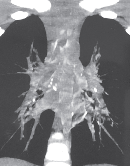 Анамнез заболевания. В процессе диспансерного наблюдения по туберкулезному контакту, в связи с положительной пробой с аллергеном туберкулезным рекомбинантным, проведена впервые мультиспиральная компьютерная томография (МСКТ) органов грудной полости 22.08.2011 (рис. 1) с внутривенным контрастированием. Заключение: «В легких без очаговых и инфильтративных изменений. Выявляются лимфоузлы трахеобронхиальной группы справа (до 8 мм), трахеобронхиальной группы слева (до 7 мм), лимфатические узлы корней легких с двух сторон (до 6 мм), бифуркационной группы (до 7 мм). В структуре лимфатических узлов корней легких и вдоль промежуточного бронха множественные кальцинаты».