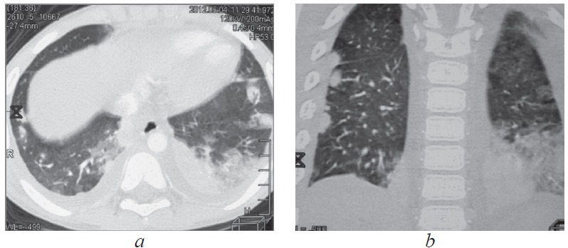 Рис. 2. Пациент, 6 лет. Компьютерная томография грудной клетки от 04.06.2012: множественные двусторонние субплевральные инфильтраты в легких, двусторонний гидроторакс (а — аксиальная проекция, b — фронтальная проекция)