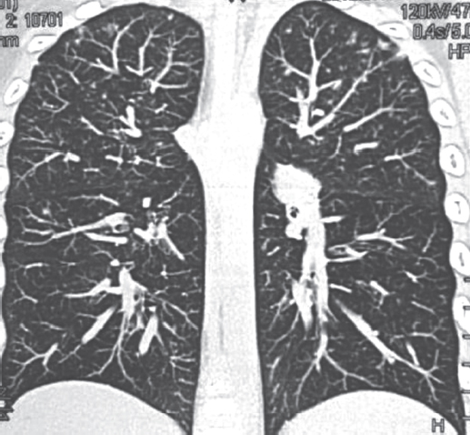 Fig. 3. Patient, 6 years old. Chest computed tomography 19.06.2012: the appearance of multiple bilateral foci in the upper lungs