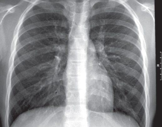 Рис. 4. Пациент, 12 лет. Обзорная рентгенограмма органов грудной клетки 16.08.2018 (6 лет наблюдения). Патологии не выявлено