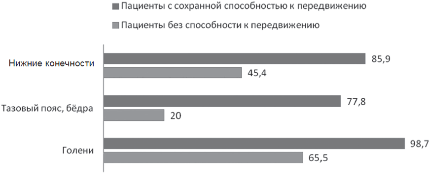 Средние значения индекса шкалы MRC для группы с сохранной способностью к передвижению составляли: 77,8 % для мышц тазового пояса и бедер, 98,7 % для мышц голеней и 85,9 % для общего количества баллов нижних конечностей. Для группы пациентов без способности к передвижению средние показатели силы мышц тазового пояса и бедер были 20 %, голеней — 65,5 %, а общее количество баллов для нижних конечностей было равно 45,4 % (рис. 3).