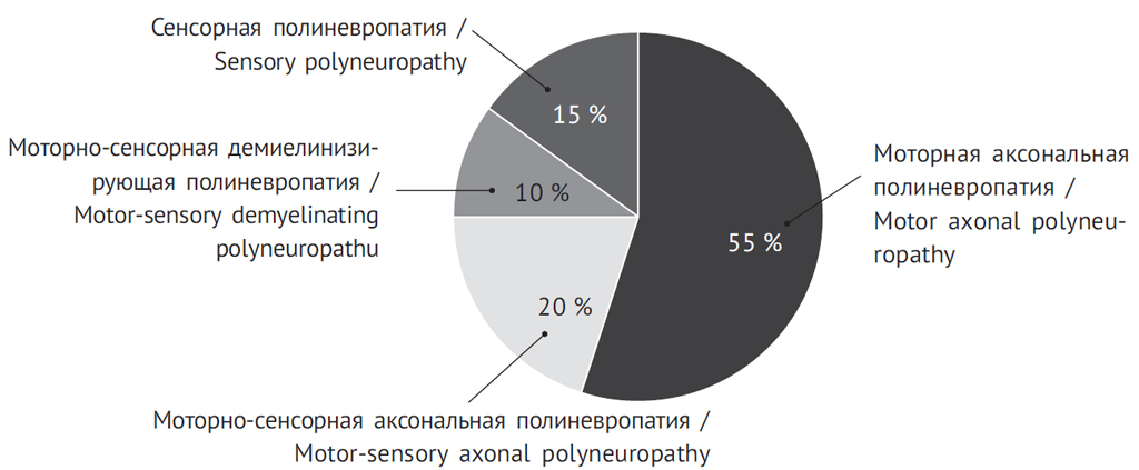 Рисунок. Распределение полиневропатий по типам поражения нервных волокон и характеру изменений периферических нервов у детей с острым лимфобластным лейкозом по результатам электронейромиографии на этапе индукционной химиотерапии