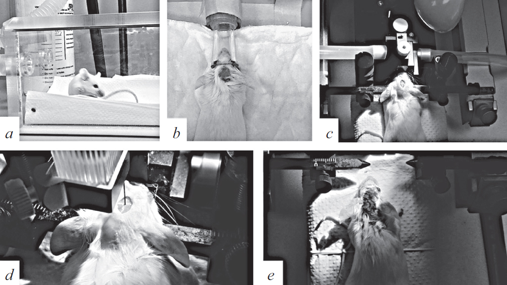 Fig. 1. Intraventricular injection of the experimental solutions: a – the animal is placed in the inhalation chamber filled with isoflurane vapors; b – exposure of the scalp under continuous supply of isoflurane; c – fixation of the animal in a stereotaxic setup with continuous supply of isoflurane, followed by craniotomy along the coordinates of the mouse stereotaxic atlas; d – fixation of the cannula in the trepanned animal brain followed by the introduction of experimental solutions; e – extraction from the stereotaxic device and reconstruction of the skin