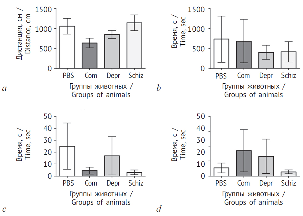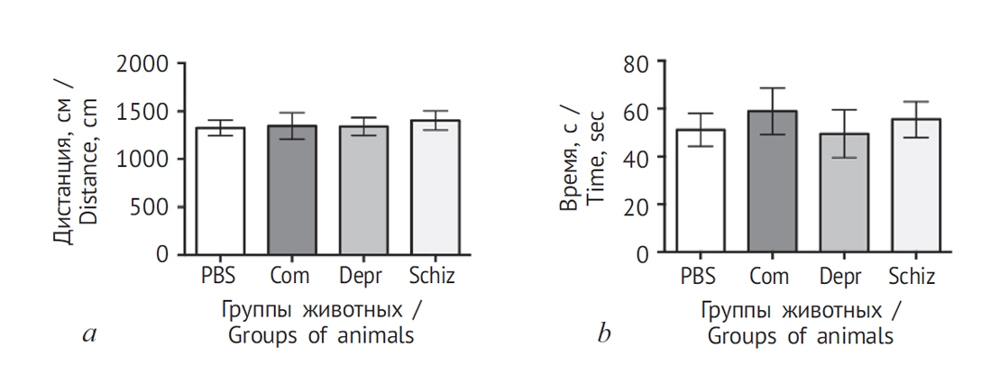 Рис. 2. Тест открытого поля: а — пройденная дистанция; b — время, проведенное в центральной зоне. Здесь и на рис. 3–8 группы животных обозначены: PBS — введение фосфат-забуференного физраствора; Com — введение поликлональных IgG здоровых доноров; Depr — введение IgG больных аутоиммунным тироидитом с депрессией; Schiz — введение IgG больных аутоиммунным тироидитом с шизофренией
