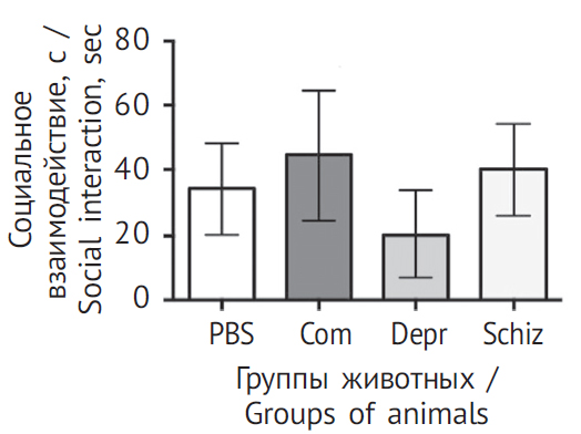 - test of social interaction (designed to study the social behavior of animals) [10]. The mouse is placed in a two-chamber box with transparent partitions for 10 min; it can move freely in both areas of the box. After 24 h, an intact mouse is placed in one zone of the box under a wire cap, and an experimental animal is placed in the opposite zone of the box. The time spent in the zone with an intact animal was assessed;