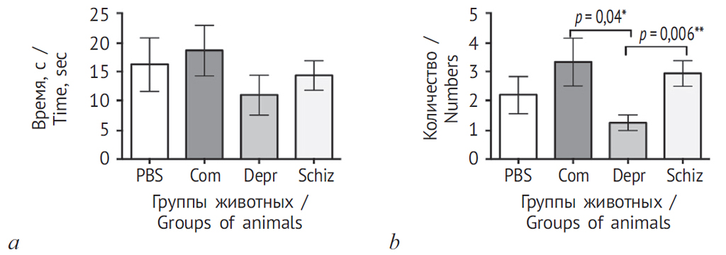 Рис. 5. Тест с крестообразным приподнятым лабиринтом: а — время, проведенное в открытых рукавах лабиринта; b — количество проявлений поведения риска (свешивания животного с открытых рукавов лабиринта). * р≥0,04; ** р≤0,006