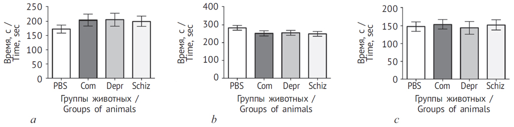 Рис. 6. Тест Порсолта на 4-й день после введения экспериментальных растворов: a — время активного плавания; b — время пассивного плавания; c — время замирания