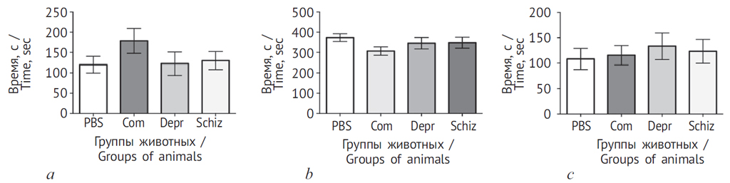 Рис. 7. Тест Порсолта на 15-й день после введения экспериментальных растворов: a — время активного плавания; b — время пассивного плавания; c — время замирания