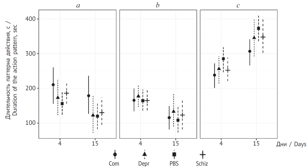 Рис. 8. Временная динамика результатов теста Порсолта по группам, с 4-го по 15-й день после инъекции: a — время активного плавания; b — время замирания; c — время пассивного плавания. Вертикальные линии — 95 % доверительный интервал