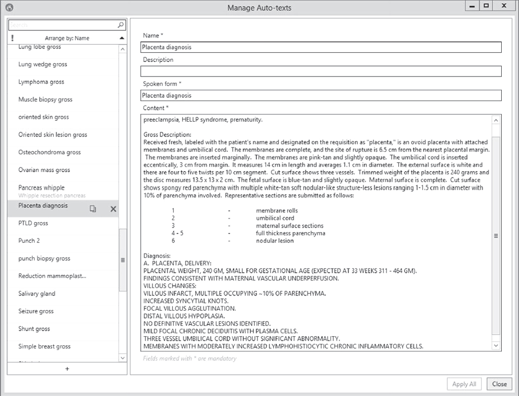 После изучения отечественной и зарубежной литературы первым этапом нашей работы стала разработка стандартных шаблонов, как для макроскопического и микроскопического описаний, так и для написания заключения. Следует отметить, что врачи клинической практики широко пользуются стандартными протоколами и схемами для лечения пациентов. В большинстве случаев терапия назначается с учетом данных заключения патологоанатома [5]. Пропущенные в патологоанатомическом описании ключевые элементы могут служить причиной неправильной формулировки диагноза и как следствие привести к неадекватному лечению пациента. С целью исключения такого рода ситуаций врачами-патологоанатомами неоднократно были предприняты попытки стандартизации патологоанатомических заключений [8, 13–15].