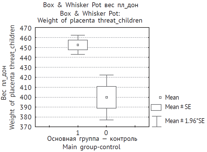 Вес плаценты доношенных новорожденных | 406,2 ± 22,6 | 452,4 ± 10,57 | < 0,05 |