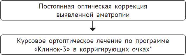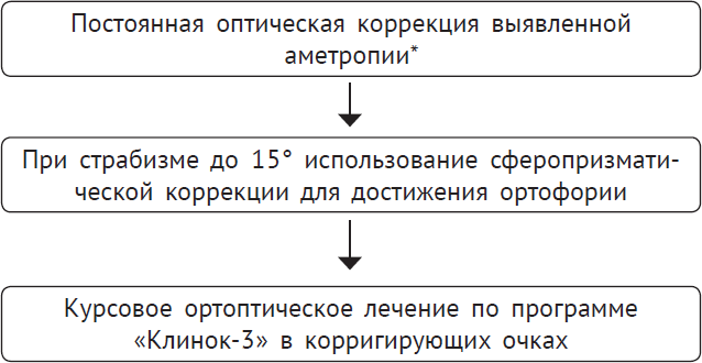 Рис. 2. Алгоритм 1. Направленность терапии детей с монолатеральным косоглазием при центральной зрительной фиксации*
