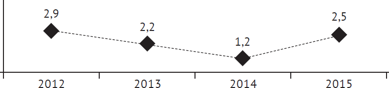 Рис. 1. Показатели уровня ранней неонатальной смертности в Белгородской области за период 2012–2015 гг. (по оси ординат указаны значения показателей ранней неонатальной смертности в ‰)
