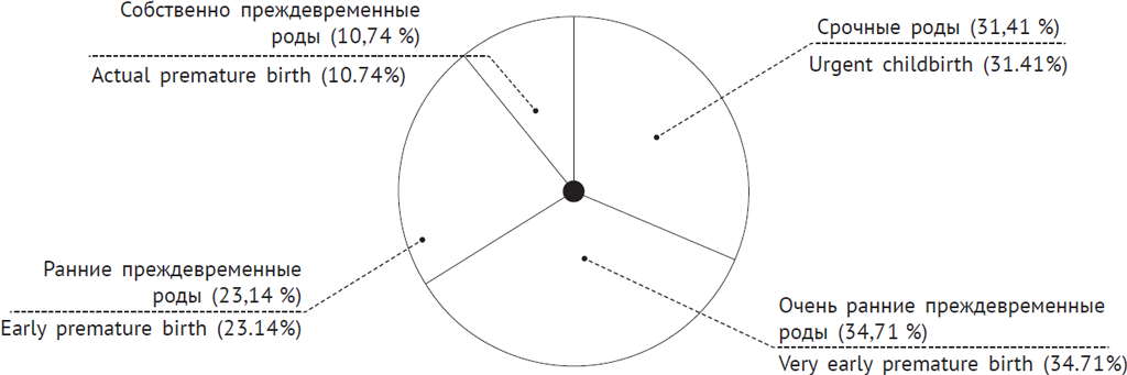Рис. 2. Распределение новорожденных, умерших в раннем неонатальном периоде, в зависимости от срока наступления родовой деятельности