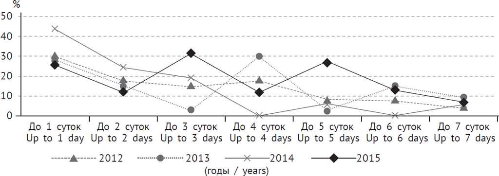 Изучение сроков РНС позволило установить, что смерть большей части детей (от 40 до 50 %) отмечалась в первые сутки после рождения. Следующим критическим периодом были третьи сутки жизни ребенка, когда смертность составляла до 30 % (рис. 3).