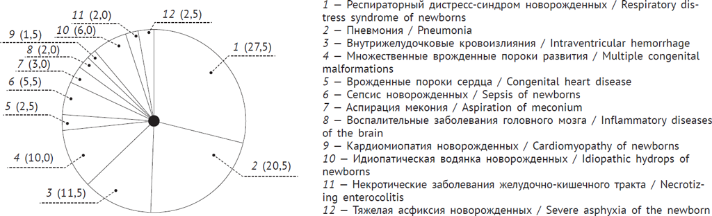 Рис. 4. Патологические состояния новорожденных (%), послужившие причиной ранней неонатальной смерти