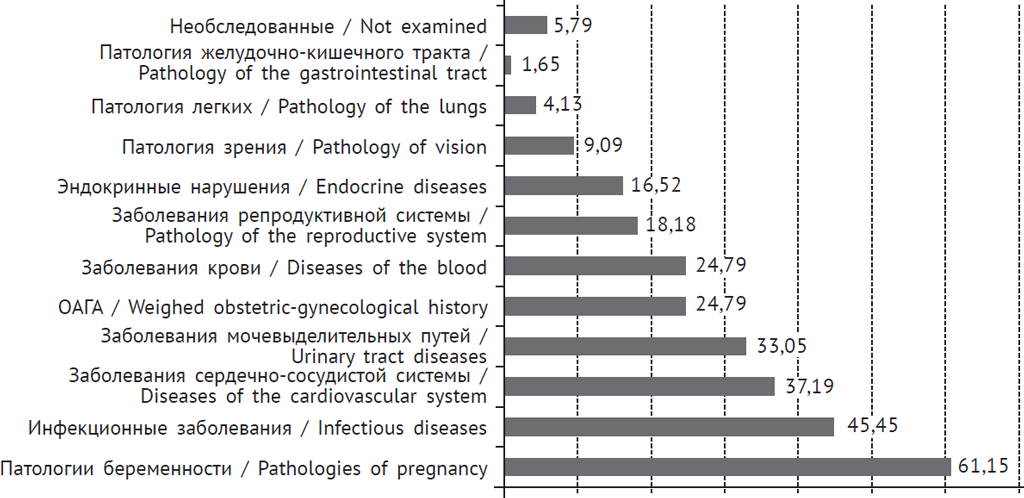 Практически у 30 % беременных женщин беременность протекала на фоне анемии различной степени тяжести (I половина беременности — 5 % беременных женщин, II половина беременности — 26 % беременных женщин). В последние годы возросла значимость тромбофилий (в 2012–2014 гг. обнаруживались единичные случаи заболевания, в 2015 г. число женщин с тромбофилией возросло до 5 %).