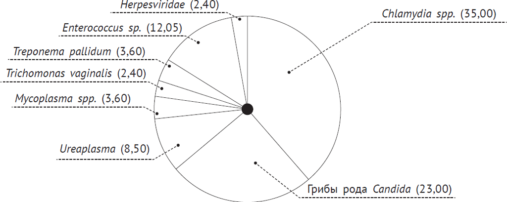 Инфекции в структуре заболеваемости женщин, дети которых умерли в РНП, занимали 45,5 %. Среди возбудителей преобладали хламидии (более чем в трети случаев), грибы рода Candida, уреаплазма, микоплазма, трихомонада и бледная трепонема (рис. 6).