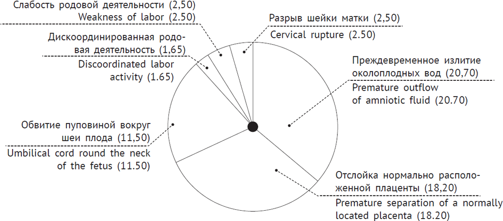 Среди патологических состояний во время родов, в случае РНС, наиболее часто встречались: прежде временное излитие околоплодных вод — 20,7 %, являющееся фактором риска внутриутробного инфицирования плода; преждевременная отслойка нормально расположенной плаценты (ПОНРП) — 18 %; обвитие пуповины вокруг шеи плода и абсолютно короткая пуповина — 12 % всех новорожденных детей. Данные состояния приводят к тяжелой гипоксии во время родов, что дополнительно утяжеляет состояние новорожденного во время родов (рис. 7).