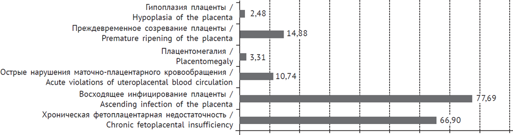 Рис. 8. Патология плаценты матерей в случаях ранней неонатальной смерти новорожденных (%)
