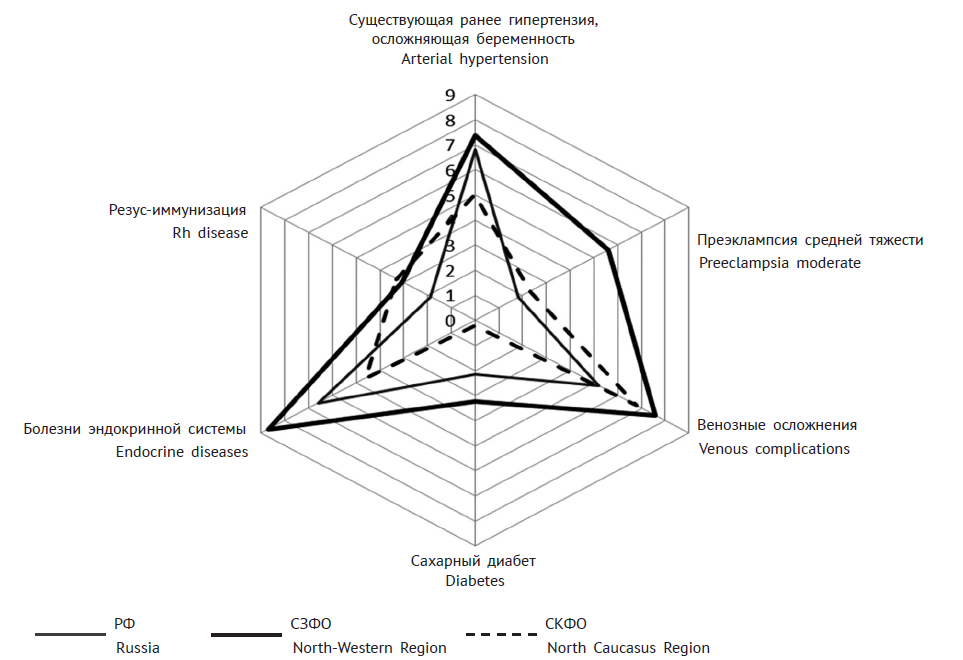Проведенный анализ показал, что заболеваемость беременных женщин Северо-Западного федерального округа (СЗФО) выше как в сравнении с уровнем заболеваемости женщин Северо-Кавказского федерального округа (СКФО), так и по России в целом. При этом, например, преэклампсия средней тяжести у беременных женщин в СЗФО в 3 раза превышала уровень по России в целом и в 2,5 раза — уровень аналогичной заболеваемости в СКФО. Показатель заболеваемости „болезни эндокринной системы“ был выше в 1,3 и 1,9 раза соответственно. Сравнение показателей венозных осложнений, существующей ранее гипертензии, сахарного диабета и угрозы прерывания беременности также демонстрирует более высокие показатели заболеваемости беременных женщин в изучаемом регионе (рис. 2).