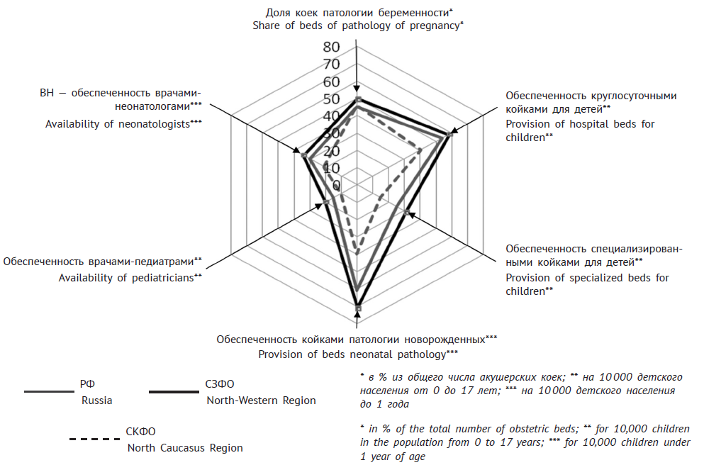 Обеспеченность врачами-неонатологами в СЗФО была на 62 % выше, чем в СКФО, и на 10 % выше общероссийского показателя, а обеспеченность врачами-педиатрами — выше на 76 и 20 % соответственно.