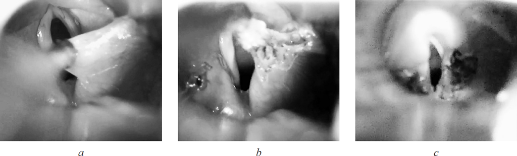 Ребенку была выполнена супраглоттопластика в объеме диссекции черпалонадгортанных складок и иссечения клиновидных хрящей (учитывая наличие клинико-эндоскопических признаков ларингомаляции 2-го типа) (рис. 3, а–с).