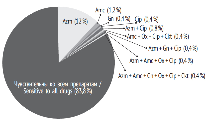 В проведенном исследовании бóльшая часть из 259 штаммов S. aureus, выделенных в детском стационаре, оказались чувствительными ко всем препаратам (83,8 % или 217 изученных культур). Удельный вес MDR-штаммов был невысок и составил всего 1,5 % (4 штамма) всех изученных штаммов S. aureus и 1,2 % всех MDR-стафилококков. Незначительным было количество XDR-штаммов (0,4 % всех изученных культур S. aureus и 0,4 % всех XDR-стафилококков). Чаще изоляты S. aureus проявляли устойчивость к азитромицину (13,9 %), амоксиклаву (2,3 %) и ципрофлоксацину (2,7 %). Единичные штаммы были устойчивы к гентамицину (1,2 %), оксациллину (1,2 %), а также к цефокситину (0,8 %). К линезолиду и ванкомицину были чувствительны все изученные культуры. Наборы детерминант резистентности золотистого стафилококка характеризовались меньшим разнообразием по сравнению с эпидермальным, число выявленных спектров, представленных комбинациями от одного до шести препаратов, оказалось в два раза меньшим (9 против 19). При этом доминировал спектр моноустойчивости к азитромицину (12,0 %). Спектр из 6 препаратов, выявленный у одного штамма, был представлен сочетанием Azm + Amc + Gn + Ox + Cip + Ckt и составлял 0,4 % (рис. 4).