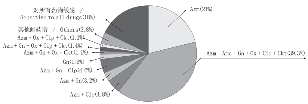 Наборы детерминант резистентности S. epidermidis были разнообразны, у них было выявлено 19 вариантов спектров антибиотикорезистентности, при этом преобладали комбинация Azm + Аmc + Gn + Ox + Cip + Ckt (39,3 % штаммов) и спектр моноустойчивости к одному Azm (21,0 %). Значительно реже встречались другие фенотипы резистентности, так, спектр Azm + Cip составил 4,8 %, Azm + Gn + Cip — 4,6 %, Azm + Gn — 3,2 % (рис. 3). Остальные спектры были представлены единичными штаммами.