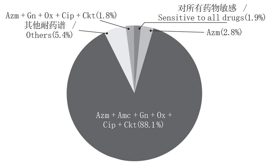 Среди 109 штаммов S. haemolyticus только два (1,9 %) оказались чувствительны ко всем антимикробным препаратам. Высокий удельный вес приходился на штаммы, устойчивые к азитромицину (97,3 %), ципрофлоксацину (93,6 %), гентамицину (92,7 %), оксациллину (92,7 %), цефокситину (92,7 %) и амоксиклаву (88,1 %). У гемолитических стафилококков выявлено 9 спектров антибиотикорезистентности (рис. 5), при этом 88,1 % (96 штаммов) обладали спектром, включающим 6 препаратов (Azm + Amc + Gn + Ox + Cip + Ckt). Два штамма (1,8 %) были резистентны к 5 препаратам (Azm + Gn + Ox + Cip + Ckt). К категории MDR принадлежал 101 штамм (92,7 % всех гемолитических и 31,1 % всех MDR-стафилококков). Удельный вес XDR-штаммов (98 изученных культур) составил 89,9 % общего числа гемолитических стафилококков и 34,5 % всех ХDR-стафилококков.