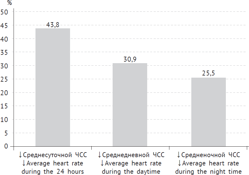 Анализ данных ХМ ЭКГ позволил выделить несколько хронобиоритмологических типов синусовой брадикардии. Так, у 43,8 % пациентов с синусовой брадикардией (n = 176) отмечалось снижение как среднедневной ЧСС, так и средненочной ЧСС ниже референсных значений. У 30,9 % (n = 124) пациентов с синусовой брадикардией наблюдалось снижение только среднедневной ЧСС < 80 уд/мин, а у 25,3 % (n = 101) лиц — снижение только средненочной ЧСС < 56 уд/мин (рис. 1).