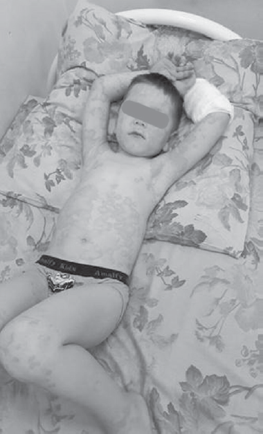 Пациент А., 5 лет 5 мес. Поступил в инфекционную клинику в экстренном порядке с диагнозом направления «скарлатина». Из анамнеза жизни известно, что ребенок от 3-й беременности, 1-х родов. Масса тела при рождении — 3520 г, длина тела — 52 см. Привит по возрасту. Детскими инфекциями не болел. Контактов с инфекционными больными не было. Перенесенные заболевания: ОРВИ 3–4 раза в год, обструктивный бронхит. Оперирован по поводу паховой грыжи, рваной раны губы. Травмы — ЗЧМТ. Аллергоанамнез не отягощен. Из анамнеза болезни известно, что за 3 недели до данного заболевания перенес острую респираторную инфекцию (кашель, насморк с нормальной температурой тела), получал симптоматическую терапию. В дебюте данного заболевания отмечались повышение температуры до фебрильных цифр, головная боль, увеличение шейных лимфатических узлов, сыпь на плечах, сухость, гиперемия и трещины губ, гиперемия щек. Осмотрен участковым педиатром, диагностирована скарлатина, назначен амоксициллин в комбинации с клавулановой кислотой. На следующий день отмечено распространение сыпи на верхние и нижние конечности, в последующем инъекция сосудов склер. Получал антибактериальную терапию в течение пяти дней, без эффекта. На 6-й день заболевания — разжиженный стул до 4 раз в сутки, однократно рвота. Госпитализирован в клинику СПбГПМУ. Лабораторно при поступлении в клиническом анализе крови выявлена гипохромная анемия легкой степени (гемоглобин 110 г/л), нейтрофильный лейкоцитоз (лейкоциты 12,2 ∙ 109/л, нейтрофилы палочкоядерные 5 %, сегментоядерные 61 %), ускорение СОЭ до 31 мм/ч. Отмечалось увеличение С-реактивного белка до 20,3 мг/л (норма < 5,8 мг/л), гиперфибриногенемия до 7,0 г/л. Расценен как пациент с псевдотуберкулезом, сочетанной (экзантемная, гастроинтестинальная, суставная) формой.