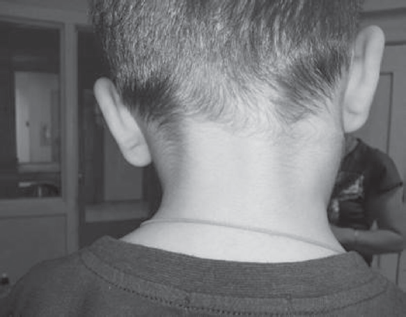 На отделении получал: цефтриаксон в течение трех дней, ибупрофен. На фоне терапии возникла новая сыпь по типу крапивницы (рис. 1), в связи с чем произведена смена антибактериальной терапии на амикацин, потребовалось однократное введение преднизолона. На второй день терапии амикацином температура тела нормализовалась, наблюдалось угасание сыпи, с крупнопластинчатым шелушением кожи пальцев рук (рис. 2), с улучшением самочувствия. Однако через 3 дня (14-й день заболевания) лихорадка возобновилась, появилась болезненность и резко увеличились заднешейные лимфоузлы справа (рис. 3), отмечались лейкоцитоз до 19 тыс., нейтрофилез до 77 %, тромбоцитоз до 699. Возобновление лихорадки было расценено как волнообразное течение псевдотуберкулеза. На фоне антибактериальной терапии наметилась положительная динамика (нормализовалась температура тела, купирован суставной синдром, улучшилось самочувствие).