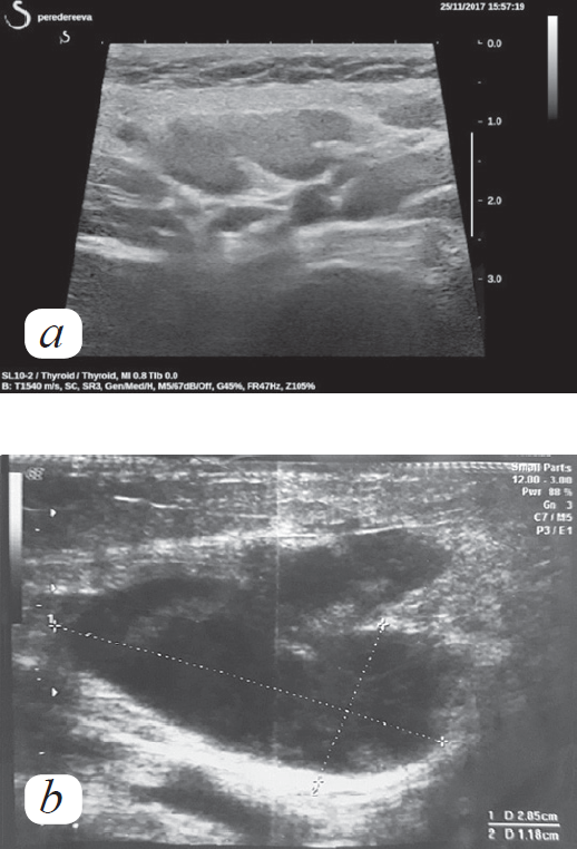 Рис. 4. Ультразвуковые изменения лимфатического узла. a: конгломераты лимфатических узлов — переднешейная группа. Узлы увеличены, дифференцировка снижена, отек окружающих тканей. b: некротически измененный лимфатический узел переднешейной группы. Дифференцировка отсутствует, в режиме цветового доплеровского картирования лимфоузел аваскулярный, контуры неровные. В центре определяются зоны разрежения ткани