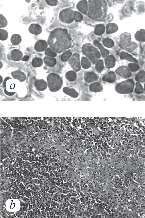Рис. 5. Микроскопическое исследование лимфатического узла. В мазках-отпечатках определяются клетки разной степени зрелости миелоидного и лимфоидного кроветворения. Виден апоптоз ядер. Окраска по Романовскому – Гимзе (a). Диффузная инфильтрация ткани лимфоузла лимфоцитами с многочисленными очагами некроза щелевидной формы, не связанными с кровеносными сосудами в корковом и мозговом веществе. В очаге некроза скопления лимфоцитов с примесью макрофагов с мелкоглыбчатым распадом ядер клеток. Немногочисленные сосуды артериального типа с утолщенными за счет гиалиноза стенками (b)